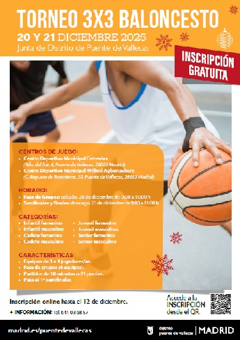 La inscripción es gratuita y puede realizarse online a través del QR que figura en el cartel hasta el día 12 de diciembre de 2025 y en la web: Torneo de Baloncesto 3×3. 20 y 21 de diciembre 2025 – Eventos Deportivos Puente de Vallecas.