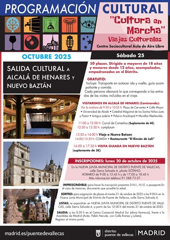 Inscripciones el lunes 20 de octubre de 2025. En la nueva Junta Municipal del distrito de Puente de Vallecas, calle Sierra Salvada 6, planta sótano. Horario: de 9 a 13:45 horas y de 17 a 18:45 horas. Más información teléfono 915 887 307.